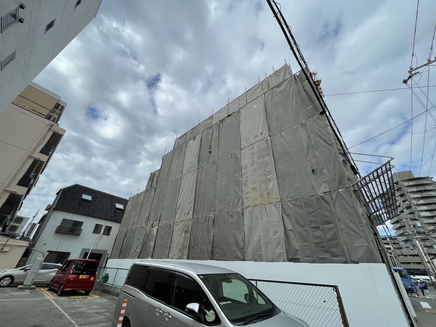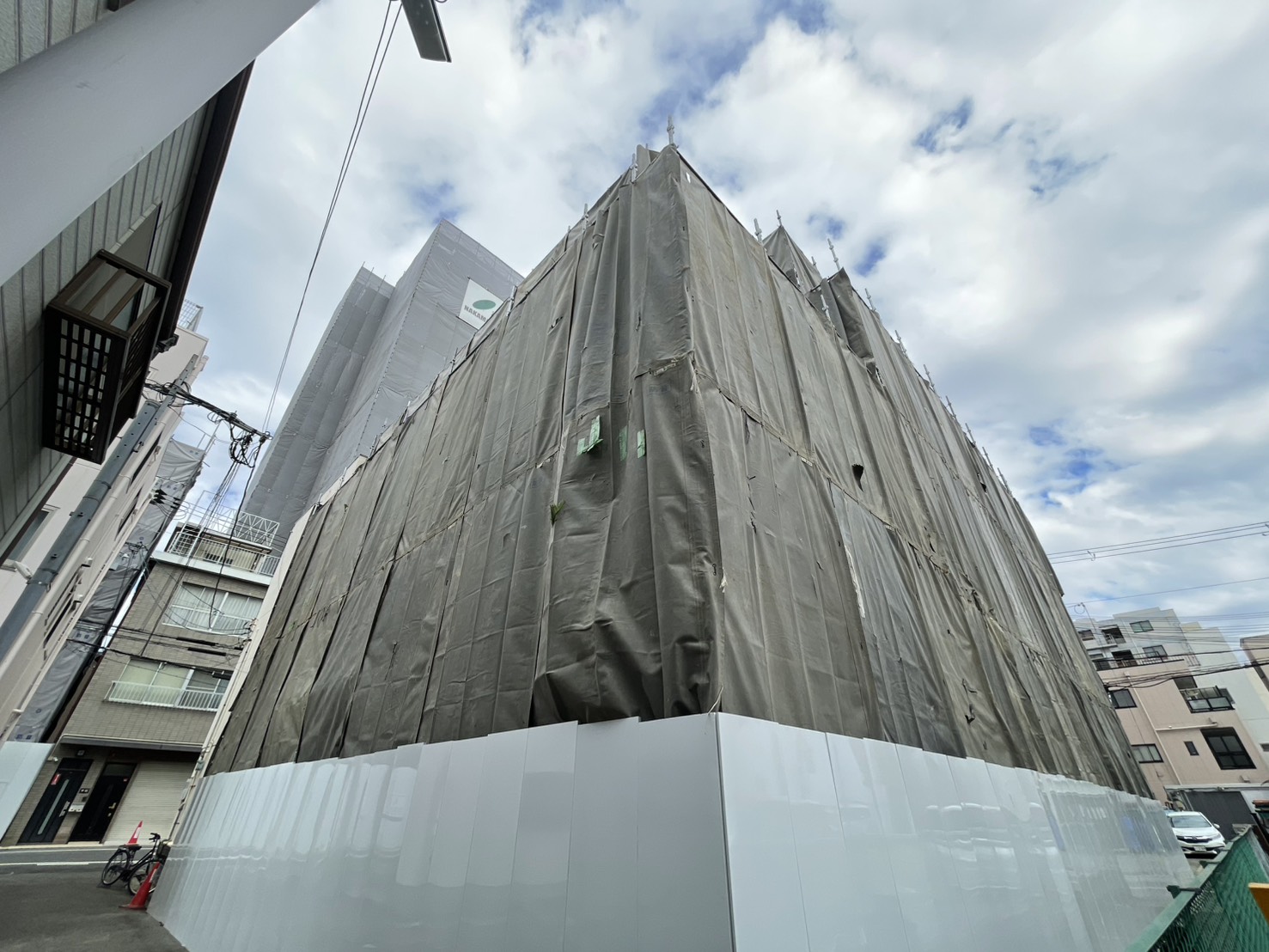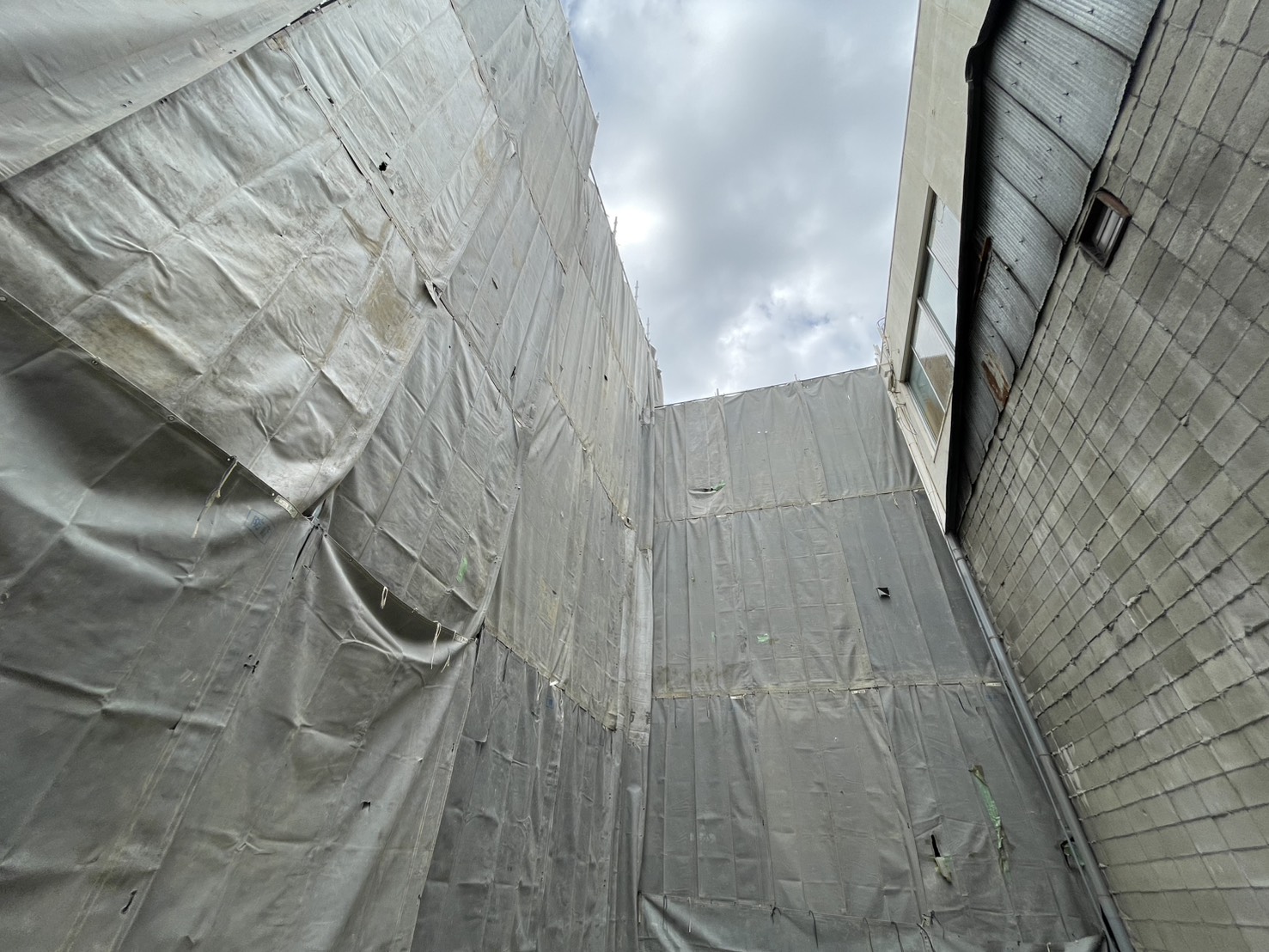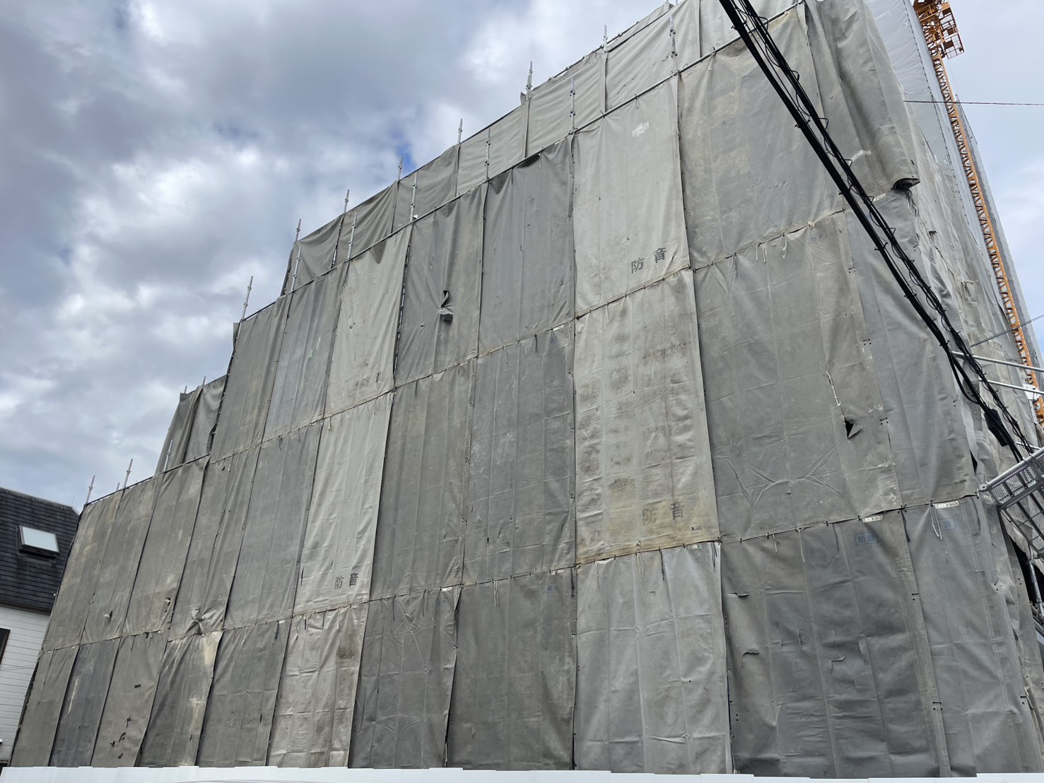 防音シートで覆われた建物は、解体作業時の粉塵飛散をしっかり防止!